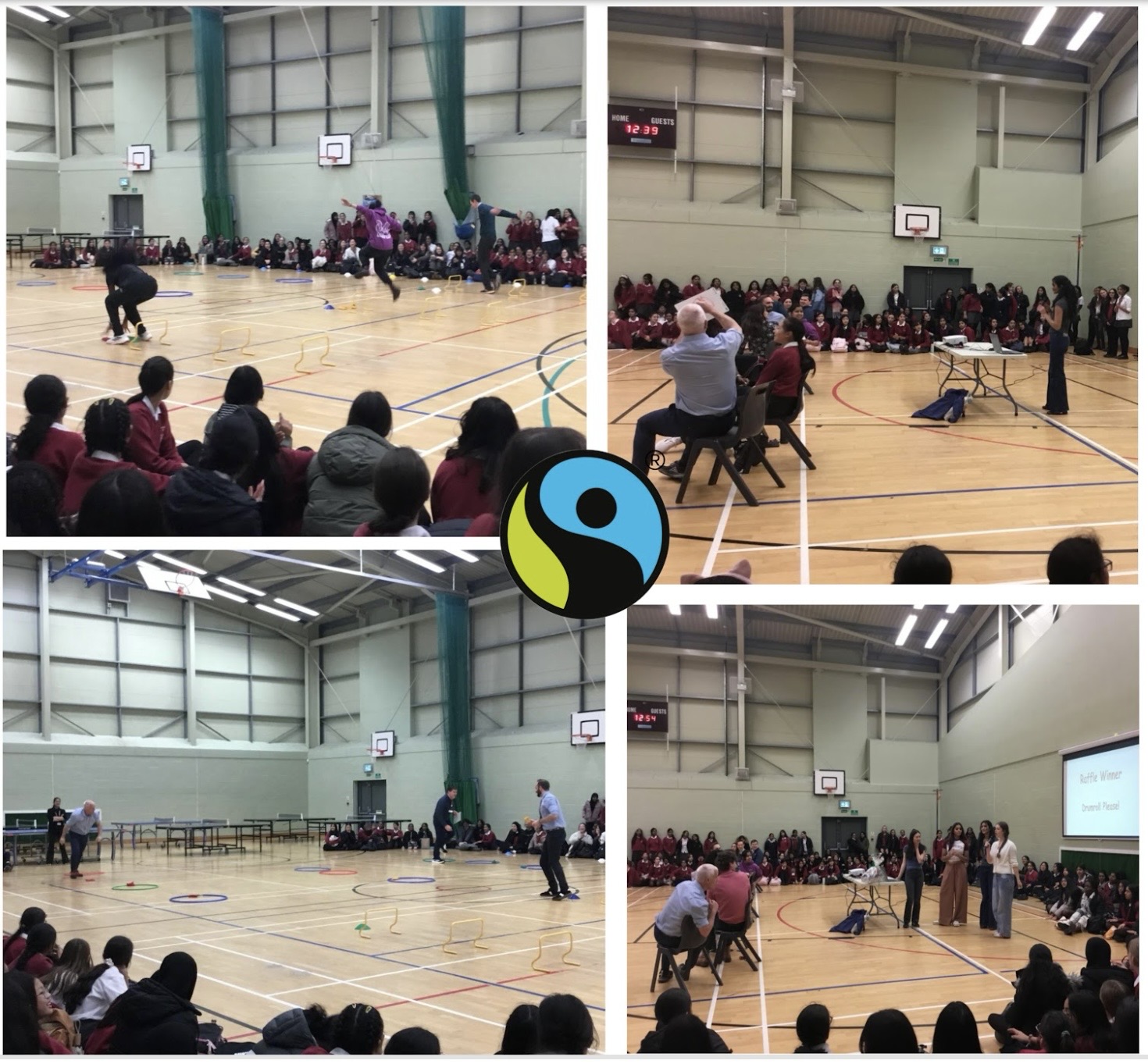 We wrapped up Fairtrade Week by holding our much loved Fairtrade teacher obstacle course and quiz, where we invited teachers to compete in teams to answer quiz questions related to Fairtrade and in particular chocolate, which is one of the main Fairtrade products. Every third question required a team member to complete the laid-out obstacle course and the athleticism of the enthusiastic participants stunned the student crowd. We are proud to announce the winners as Team 1: Mr Curran, Mr Berluti and Mrs Munns, whose speedy answers and affinity for hula-hooping guaranteed them the win. We were glad to see a variety of year groups attending the event, and we hope they found it as entertaining as we did!